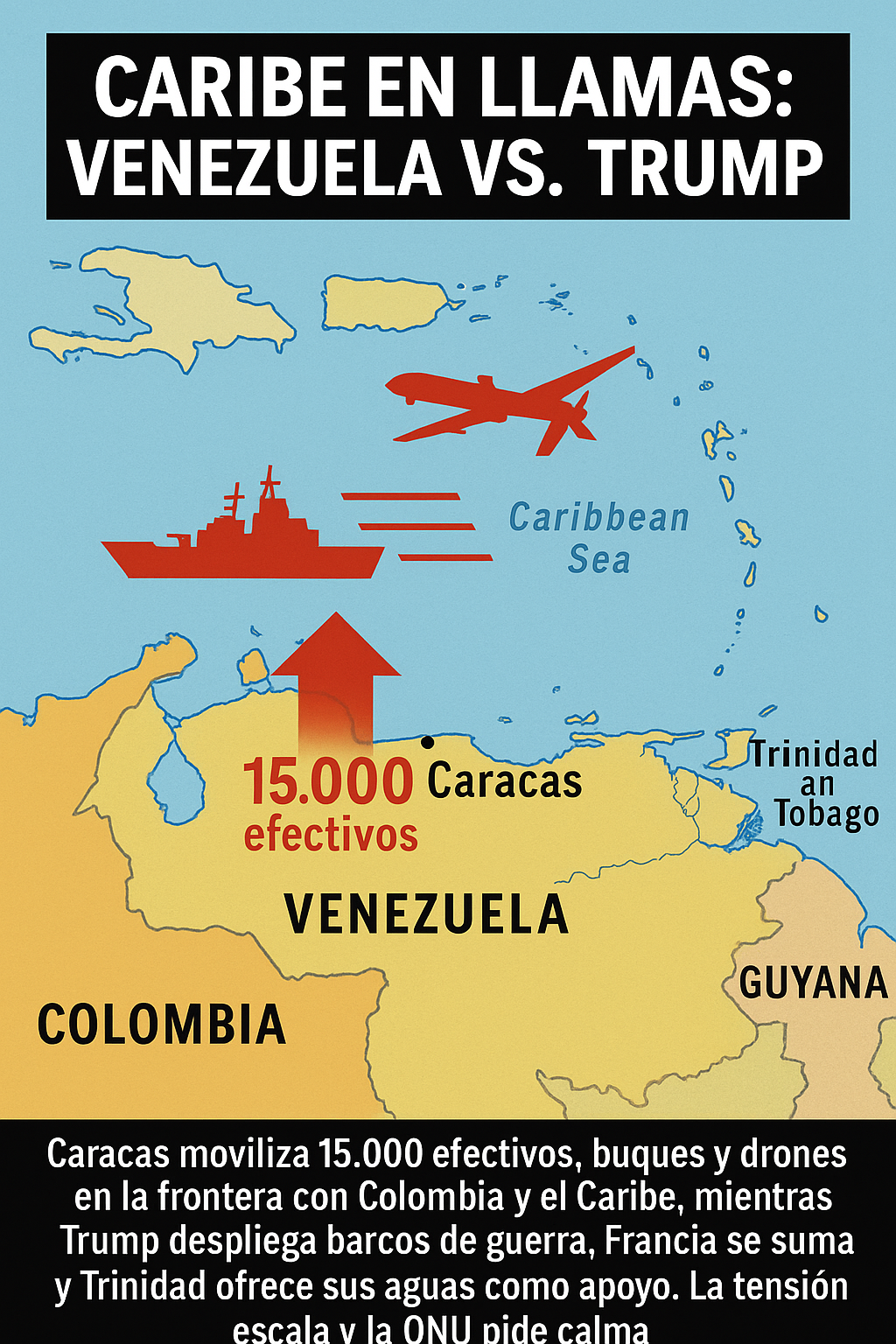 -Caracas moviliza 15.000 efectivos, buques y drones en la frontera con Colombia y el Caribe, mientras Trump despliega barcos de guerra, Francia se suma y Trinidad ofrece sus aguas como apoyo. La tensión escala y la ONU pide calma-