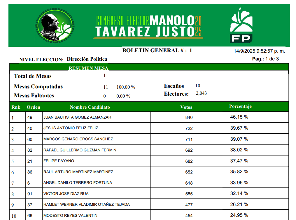 La Fuerza del Pueblo (FP) concluyó este domingo 14 de septiembre de 2025 su congreso elector “Manolo Tavares Justo”, con la elección de 10 nuevos integrantes de la Dirección Política, el órgano encargado de ejecutar la línea diaria del partido. El proceso se llevó a cabo en un ambiente de entusiasmo y participación masiva de la militancia.