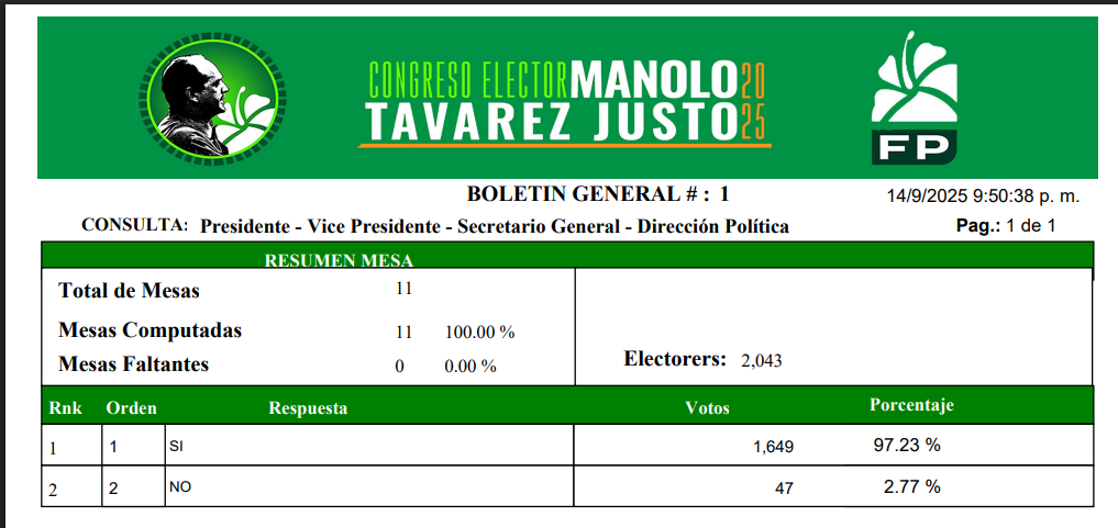 En la consulta interna realizada por la Fuerza del Pueblo para ratificar las principales autoridades del partido, participaron 2,043 electores, de los cuales 1,649 votaron a favor (97.23 %) y 47 en contra (2.77 %), con el 100 % de las mesas computadas (11 de 11). Los resultados validaron de manera contundente la elección del presidente, vicepresidente, secretario general y la ampliación de la Dirección Política, consolidando así el proceso de legitimación y fortalecimiento institucional de la organización.