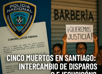 El miércoles por la tarde, la avenida Olímpica del sector La Barranquita en Santiago se convirtió en escenario de sangre y confusión. La Policía Nacional informó de un “intercambio de disparos” en una plaza comercial que dejó como saldo cinco hombres muertos e, irónicamente, un agente herido en medio de la supuesta refriega.